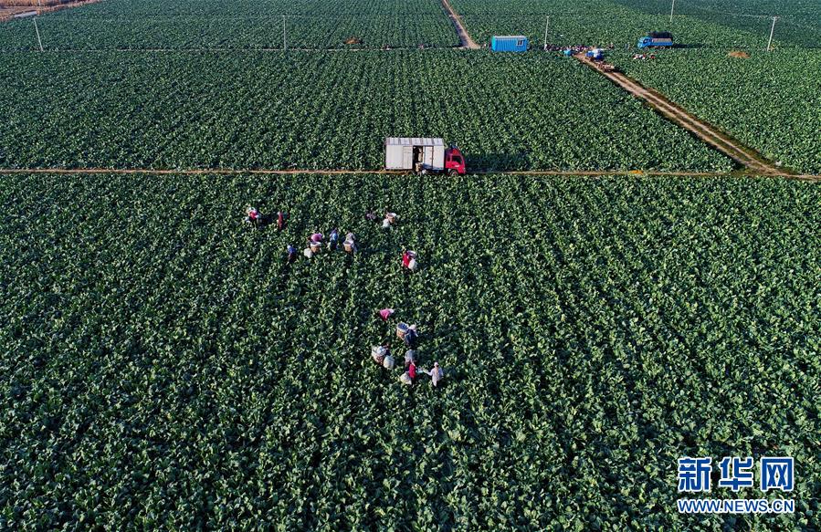 10月29日,樂亭縣馬頭營(yíng)鎮(zhèn)馬頭營(yíng)村的農(nóng)民在收獲菜花(無人機(jī)拍攝)。 新華社記者楊世堯攝