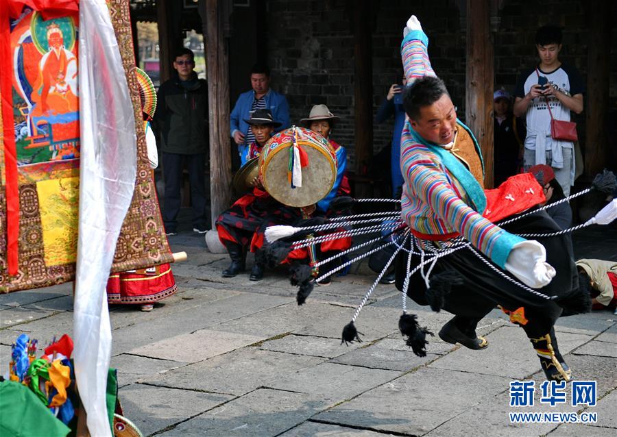 在浙江烏鎮(zhèn)西柵景區(qū)的安渡坊碼頭廣場上,西藏迥巴藏戲隊表演藏戲《頓月頓珠》(10月28日攝)。 新華社記者 張汝鋒 攝