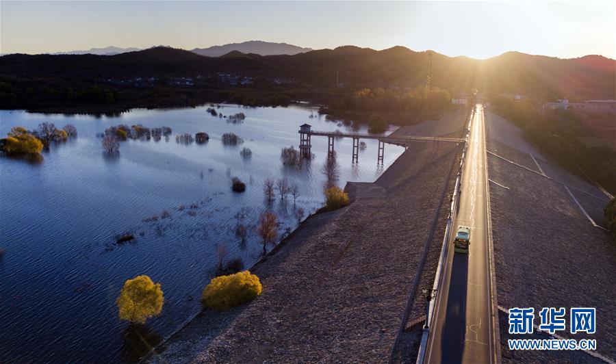 10月30日,一輛汽車行駛在北京密云水庫的大壩上(無人機(jī)拍攝)。