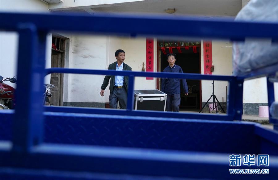 10月30日,曾紀連(右)和家人將電影放映設備裝入三輪車,準備進村放映電影。新華社記者 胡晨歡攝