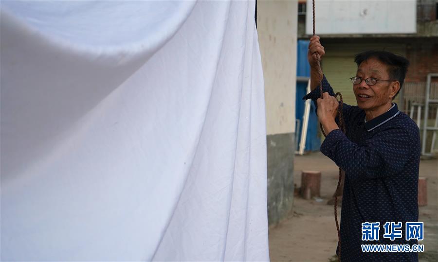 10月30日,曾紀連在寬田鄉(xiāng)山下村布置電影放映需要的幕布。 新華社記者 胡晨歡攝