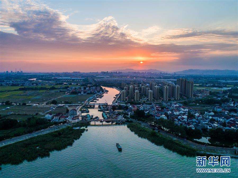 這是2018年9月27日航拍的夕陽下的新塘村。浙江省長興縣新塘村毗鄰太湖,該村以蔬菜種植、水產捕撈為主導產業(yè),素有“浙北水產第一村”之稱。新華社記者 徐昱 攝