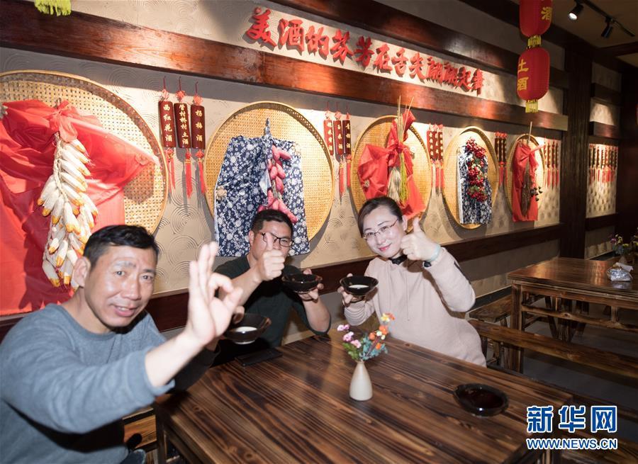 游客在浙江省建德市大同鎮(zhèn)管村橋村文化禮堂品嘗該村特產土酒(2018年3月13日)。2017年起,建德市對農村文化禮堂建設進行“一村一品”提升改造,打造惠民、育德、展示等為一體的文化禮堂,嘗試“鄉(xiāng)村文創(chuàng)客廳”建設,促進鄉(xiāng)村振興。新華社記者 翁忻旸 攝