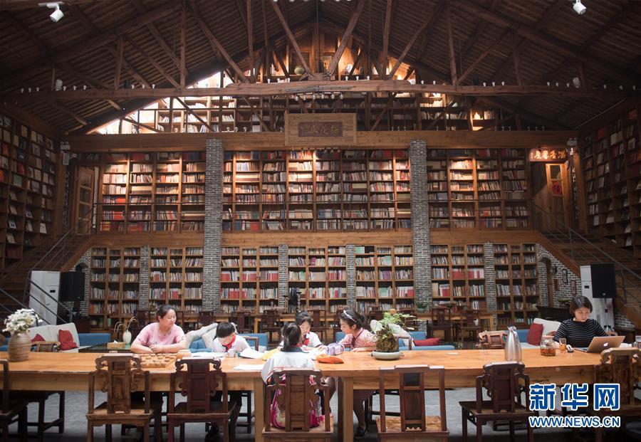 浙江省德清縣莫干山鎮(zhèn)廟前村小學生在“莫干山居圖”民宿里讀書(2018年5月29日攝)。2012年,在杭州從事出版業(yè)的朱錦東,想要回到從小生活的鄉(xiāng)村,他租下莫干山鎮(zhèn)廟前村廢舊閑置的禮堂,將其改造成為一家書香四溢的民宿,起名為“莫干山居圖”。他將琴棋書畫引入居住空間,民宿在2015年開業(yè)后迅速打響了名氣,目前年接待住客7000人次。新華社記者 翁忻旸 攝