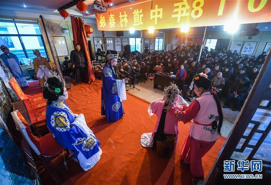 2018年2月6日,長興風華藝術團的演員們?yōu)楹闃蜴?zhèn)中道村的村民們演出越劇。據了解,長興縣每年都會安排100多場“送戲下鄉(xiāng)”活動,滿足村民的精神文化需求。新華社記者 徐昱 攝