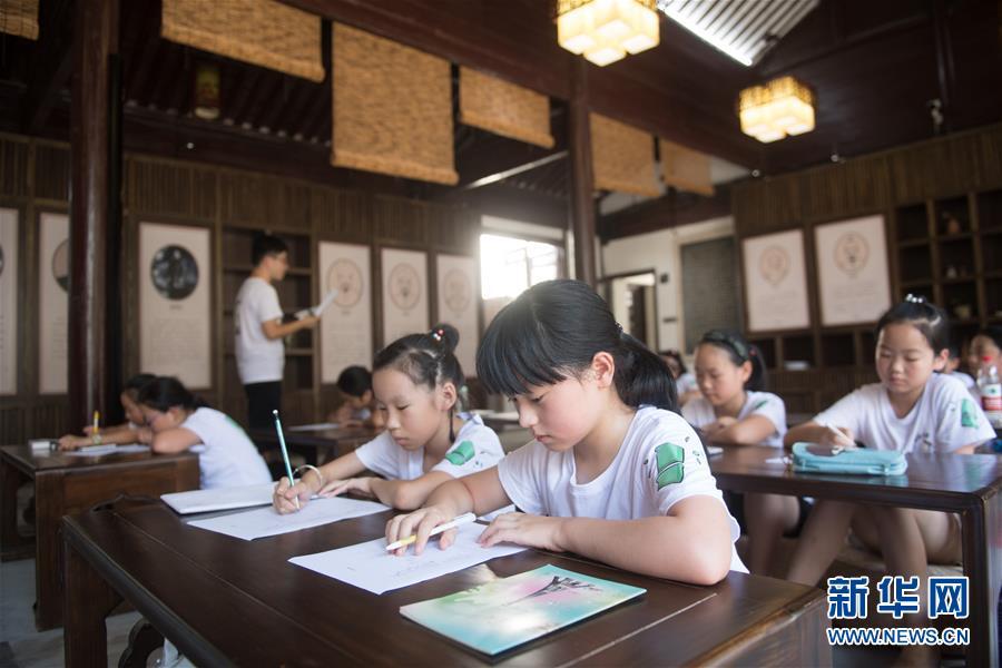 小學生在浙江省德清縣乾元鎮(zhèn)國學圖書館參加國學夏令營(2018年7月19日攝)。浙江省德清縣積極推進鄉(xiāng)鎮(zhèn)特色圖書館建設,將閑置老建筑改造成設計獨特、藏書豐富、活動多彩的圖書館,有力助推鄉(xiāng)村文化振興。新華社記者 翁忻旸 攝