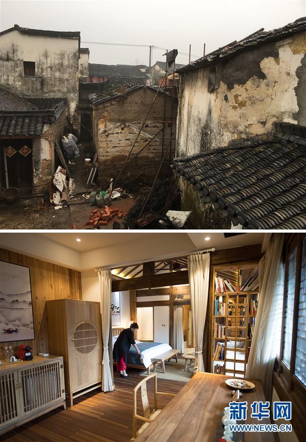 拼版照片,上圖為浙江省桐廬縣江南鎮(zhèn)深澳村“三生一宅”民宿改建前破舊的民房;下圖為工作人員在整理浙江省桐廬縣江南鎮(zhèn)深澳村“三生一宅”民宿房間(2018年4月23日攝)。 新華社記者 翁忻旸 攝