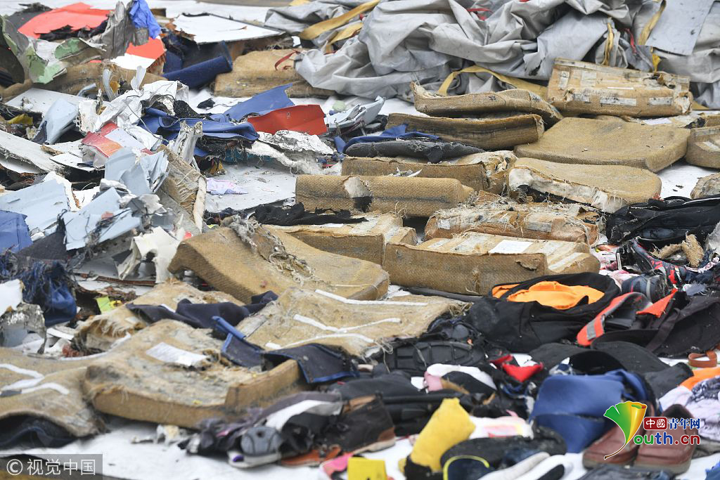 搜救人員打撈上來飛機(jī)的殘骸。
