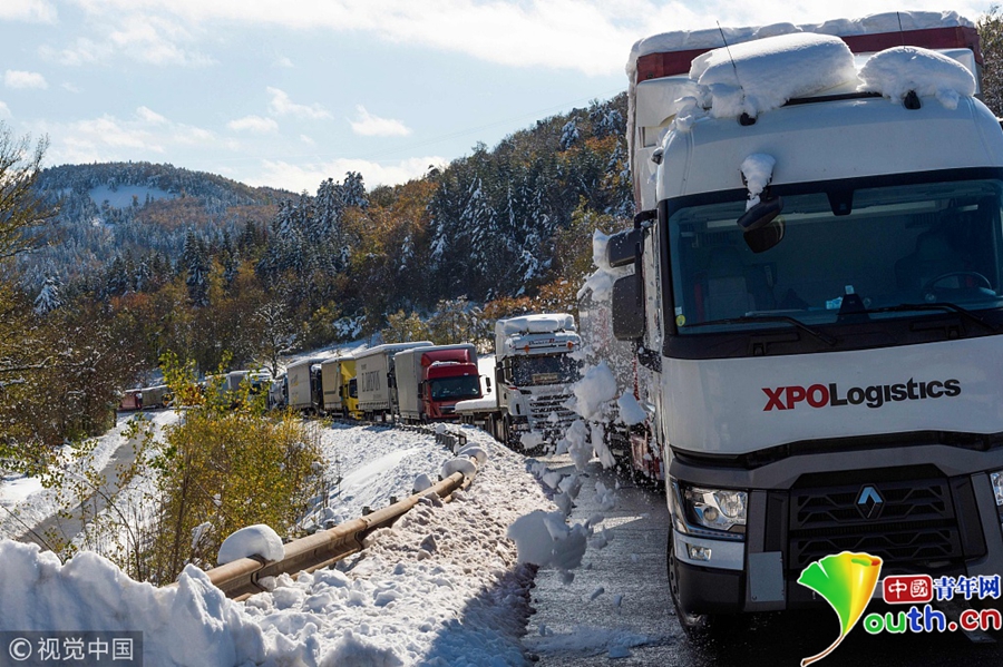 當?shù)貢r間2018年10月30日,法國菲克斯圣熱內,當?shù)赝唤荡笱瑢е?50人被困在大雪覆蓋的公路上,不得不睡在緊急救援中心。法國國家氣象局已經(jīng)將當?shù)刂糜诔壬踩渲隆?/p>