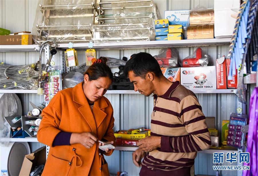 在位于澤普縣桐安鄉(xiāng)的建材鋪里,熱娜古麗·喀爾曼(左)跟前來購買建材的顧客交談(10月28日攝)。 新華社記者 關(guān)俏俏 攝