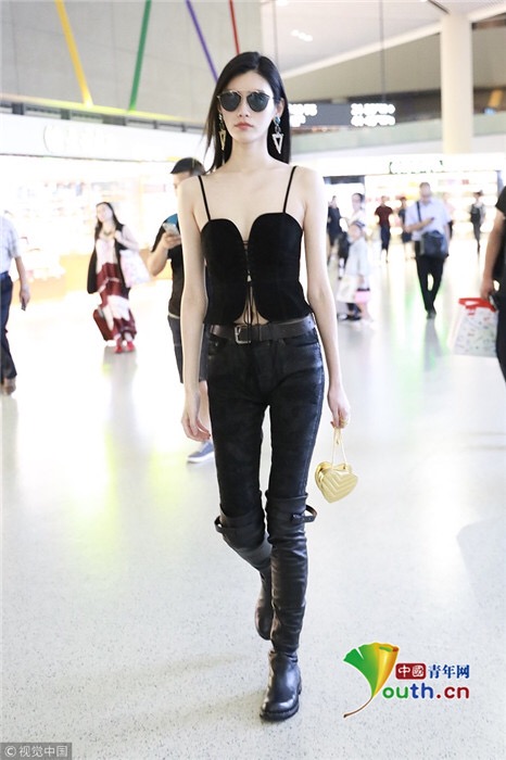 2018年7月25日,上海,奚夢(mèng)瑤現(xiàn)身機(jī)場(chǎng),她穿吊帶馬甲配過膝長(zhǎng)靴,頻撩發(fā)似女特工。