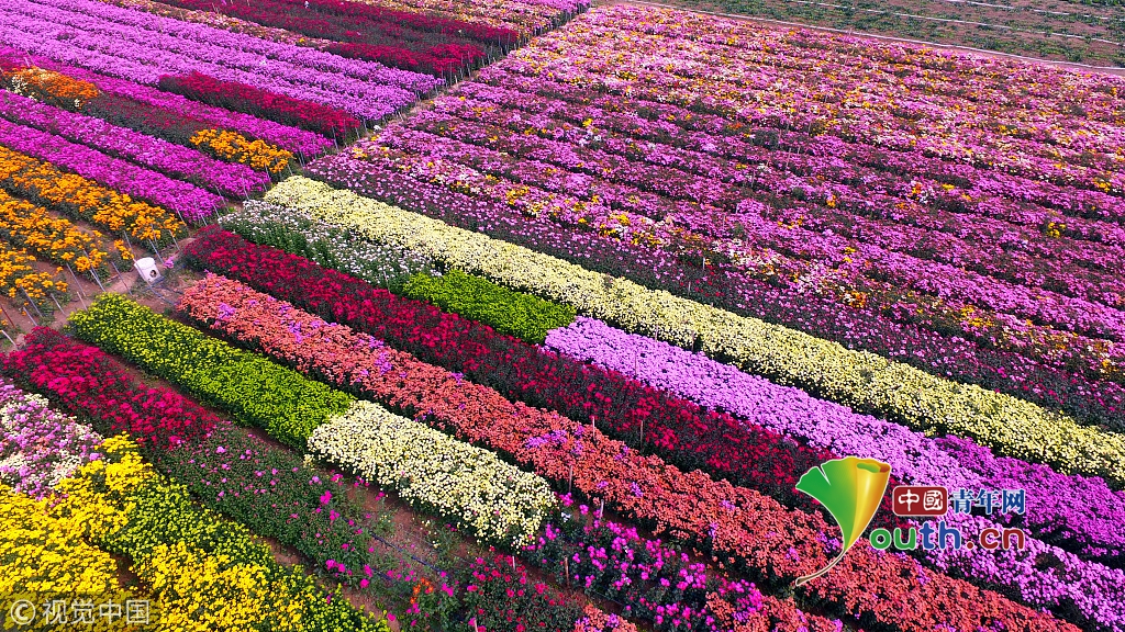 河南許昌觀賞彩菊綻放如五彩地毯 航拍展現(xiàn)震撼美