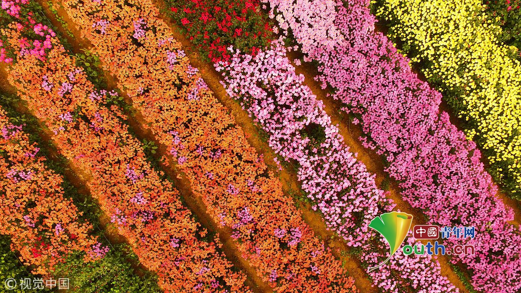 河南許昌觀賞彩菊綻放如五彩地毯 航拍展現(xiàn)震撼美