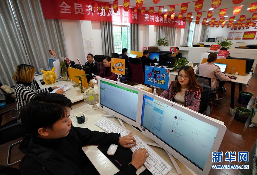 11月3日,貴溪市美納途箱包公司的客服人員在接受客戶咨詢。該公司推出的“雙十一”購物節(jié)預(yù)售活動(dòng)已經(jīng)開始。新華社記者宋振平攝