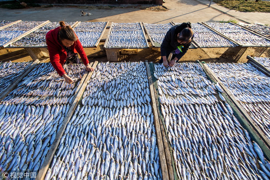 江西都昌縣薌溪鄉(xiāng)的漁民趁著晴好天氣翻曬捕撈上岸的魚蝦。