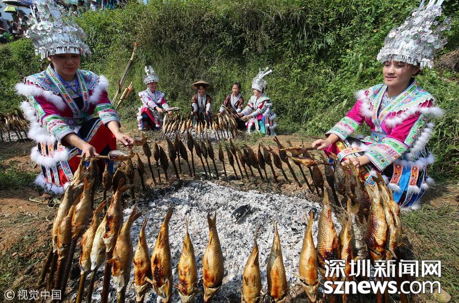 深圳新聞網(wǎng)訊 2018年9月15日,廣西柳州市融水苗族自治縣喜迎中國首屆“農(nóng)民豐收節(jié)”——2018金秋燒魚季啟動(dòng)儀式在桿洞鄉(xiāng)花孖苗寨舉行,數(shù)百名苗族群眾和游人共同開展了水田拔河、田間捉魚、傳統(tǒng)打谷和燒魚等活動(dòng),慶祝豐收。