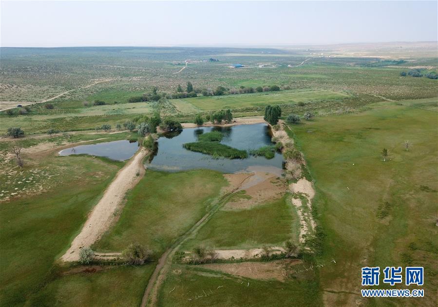 內蒙古杭錦旗沙日召嘎查牧民白音道爾計治理過的庫布其沙漠(7月31日無人機拍攝)。 新華社記者邢廣利攝