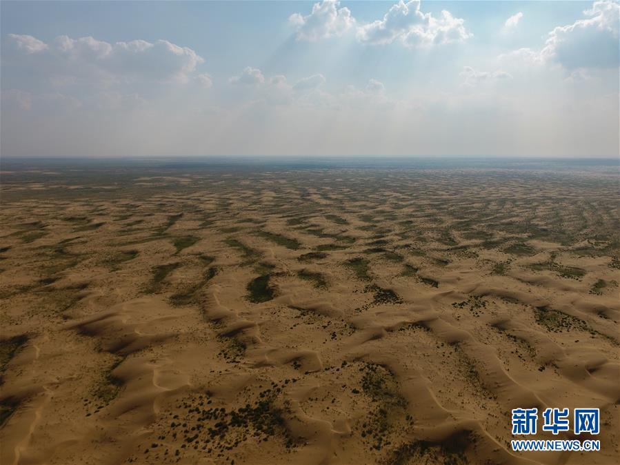 庫布其沙漠深處,植被與沙漠形成美麗的紋理(7月31日無人機(jī)拍攝)。新華社記者劉磊攝