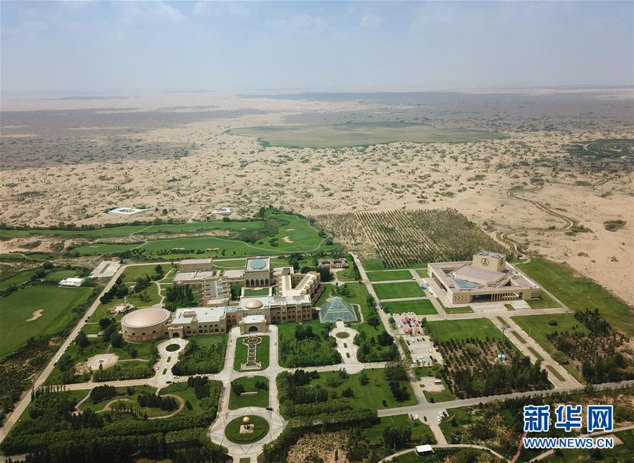 位于內(nèi)蒙古杭錦旗的七星湖沙漠酒店(8月1日無人機拍攝)。 新華社記者邢廣利攝