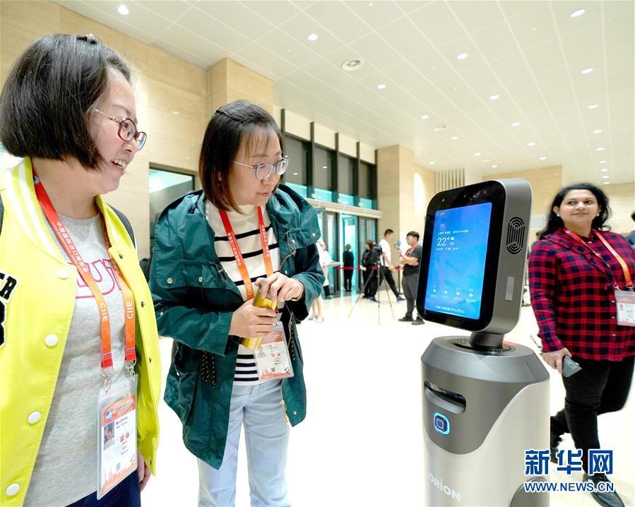 11月4日,媒體記者在首屆中國國際進(jìn)口博覽會新聞中心和引導(dǎo)機(jī)器人互動。 新華社記者陳建力攝