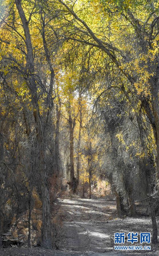新疆輪臺(tái)縣胡楊林深處的一條小路(10月25日攝)。 10月中下旬,靜靜的塔里木河中下游一片金黃。胡楊深處,條條小路蜿蜒綿長通向遠(yuǎn)方,引人入勝。 塔里木河是中國最長的內(nèi)陸河,這一區(qū)域原始胡楊林分布較為集中。隨著塔里木河連續(xù)19次向下游生態(tài)輸水,為胡楊林“解渴”,塔河兩岸生態(tài)得到明顯改善,沙地面積逐年減少。 新華社記者趙戈攝