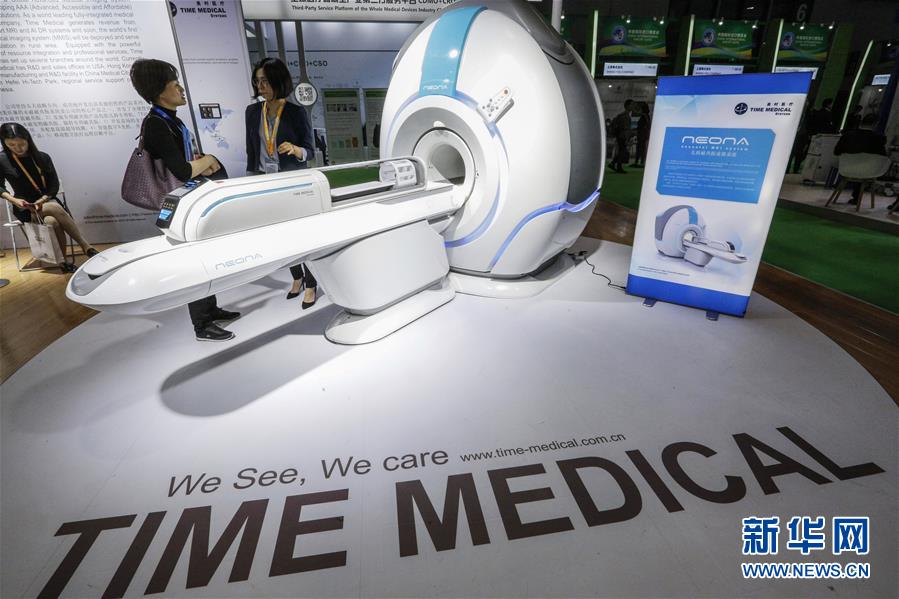 11月6日,觀眾在美國通用電氣公司展臺參觀CT機。新華社記者 丁汀 攝