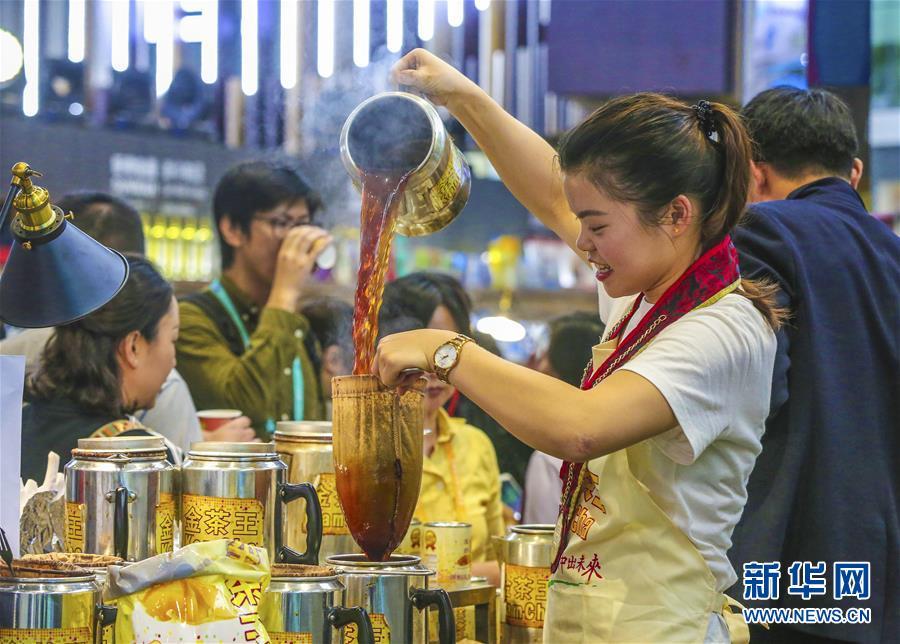 11月7日,在進博會食品及農產(chǎn)品展區(qū),參展人員制作“金茶王”港式奶茶。 新華社記者 殷剛 攝