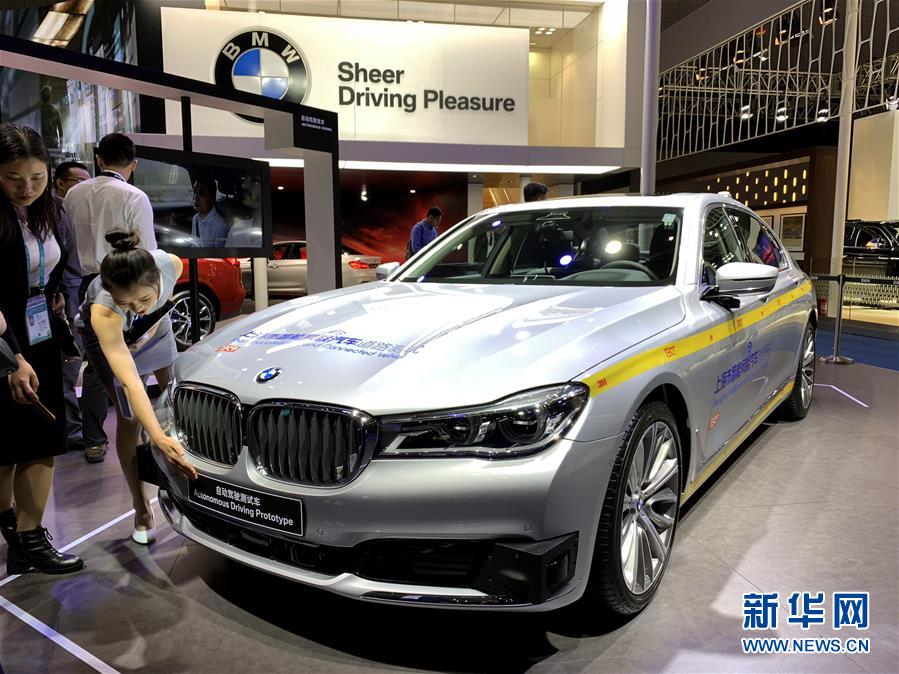 這是11月7日在汽車展區(qū)拍攝的配備L4級(jí)自動(dòng)駕駛技術(shù)的寶馬7系測(cè)試車。新華社記者 牛曉雷 攝