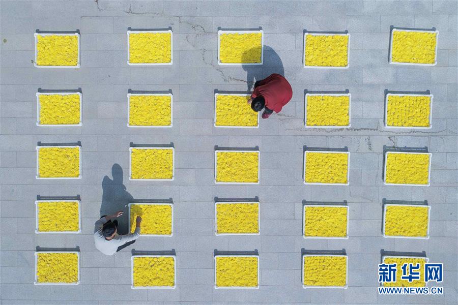 11月7日,河北省魏縣魏城鎮(zhèn)町上村農(nóng)民在分揀晾曬菊花(無人機(jī)拍攝)。 新華社記者 朱旭東 攝
