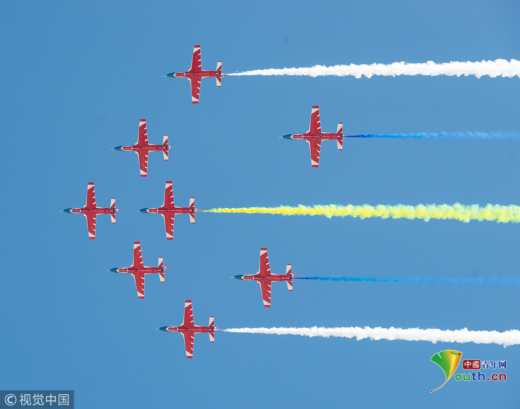 2018年11月7日,廣東珠海,第12屆珠海航展在金灣機場如火如荼進行??哲姾娇沾髮W“紅鷹”飛行表演隊在第十二屆中國航展進行了飛行表演,展示了飛行員精湛的飛行技能。視覺中國