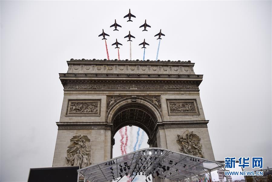 11月11日,在法國巴黎,“法蘭西巡邏兵”飛行表演隊在紀念儀式上飛過凱旋門。當日,法國政府在巴黎凱旋門前舉行儀式,隆重紀念第一次世界大戰(zhàn)結(jié)束一百周年。新華社記者 陳益宸 攝