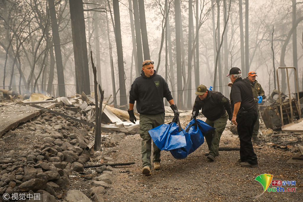 當?shù)貢r間2018年11月10日至11月11日,美國加州Paradise,當?shù)厣交鹚僚埃伟补賯冊跒膮^(qū)搜尋遇難者遺體。圖片作者:Gabrielle Lurie