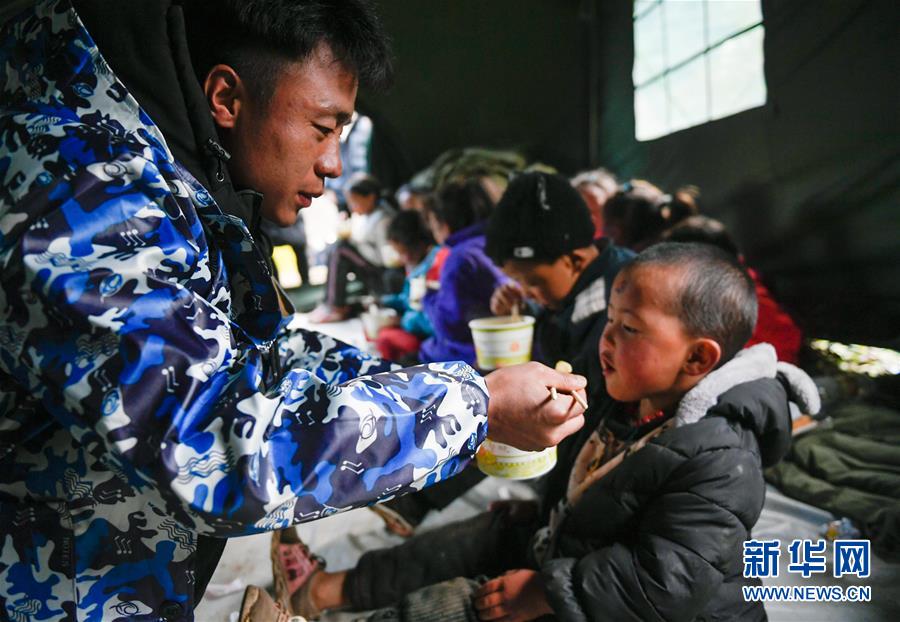 波羅鄉(xiāng)一名工作人員在臨時(shí)過(guò)渡安置點(diǎn)帳篷內(nèi)給一名兒童喂飯(10月14日攝)。 新華社記者 劉東君 攝