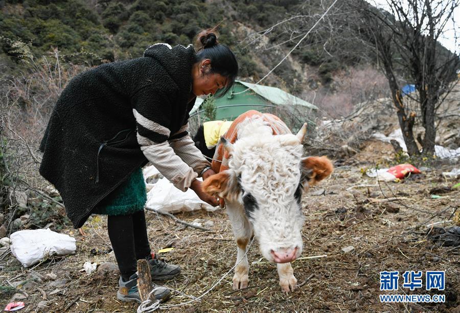 波羅鄉(xiāng)一臨時(shí)過(guò)渡安置點(diǎn)內(nèi)的群眾在放牛(10月14日攝)。 新華社記者 劉東君 攝