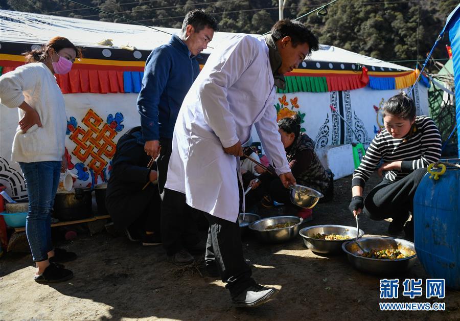 11月12日,在西藏昌都市江達(dá)縣波羅鄉(xiāng)康扎西安置點(diǎn),工作人員在臨時(shí)廚房打飯。 西藏自治區(qū)江達(dá)縣波羅鄉(xiāng)康扎西安置點(diǎn),離波羅鄉(xiāng)政府直線(xiàn)距離約3公里,位于一處地勢(shì)開(kāi)闊平緩的山谷中,比堰塞湖水面高出100多米。10月11日金沙江白格段山體滑坡發(fā)生后,當(dāng)?shù)鼐驮谶@里設(shè)立了安置點(diǎn),安置附近受災(zāi)群眾。 新華社記者 劉東君 攝
