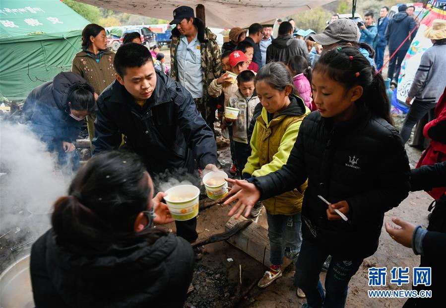 波羅鄉(xiāng)工作人員在臨時(shí)過(guò)渡安置點(diǎn)內(nèi)為波羅鄉(xiāng)第一小學(xué)學(xué)生盛晚飯(10月14日攝)。 新華社記者 劉東君 攝