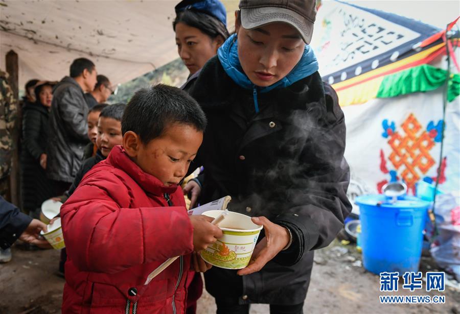 波羅鄉(xiāng)工作人員在熱多村安置點(diǎn)內(nèi)的“臨時(shí)做飯點(diǎn)”為波羅鄉(xiāng)第一小學(xué)學(xué)生盛晚飯(10月14日攝)。