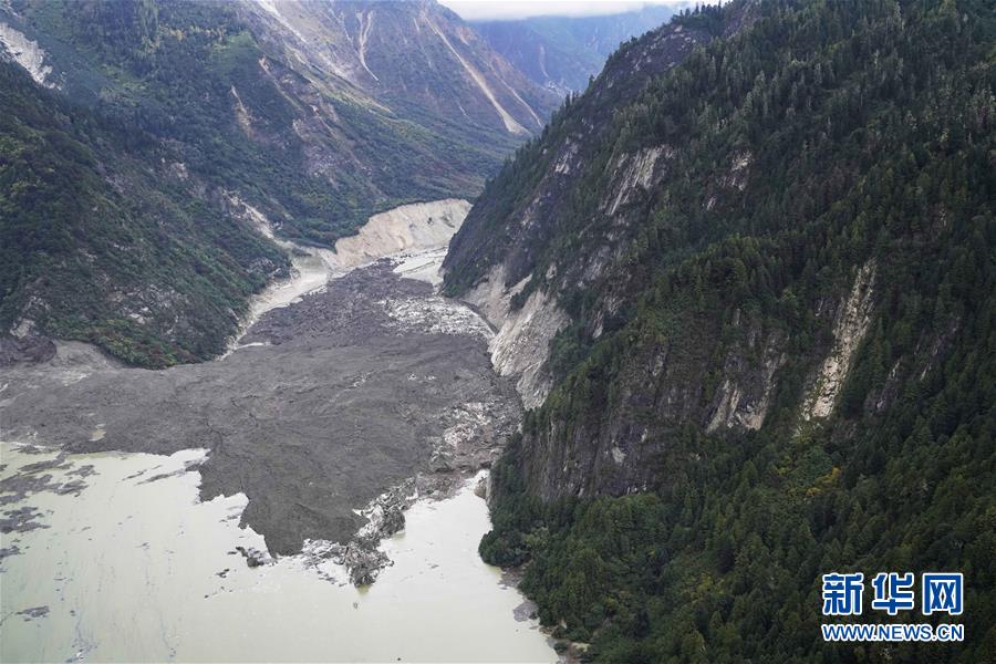 空中俯瞰堰塞湖和堰塞體(10月18日攝)。