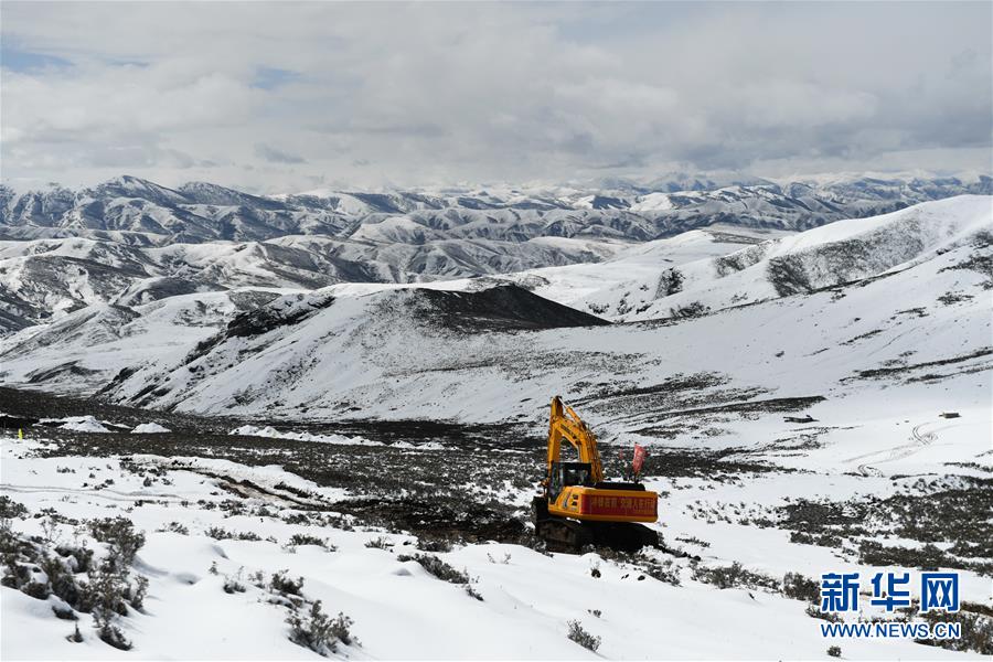 工作人員駕駛大型機(jī)械在昌都市江達(dá)縣的高山牧場上搶通道路(10月14日攝)。新華社記者 劉東君 攝