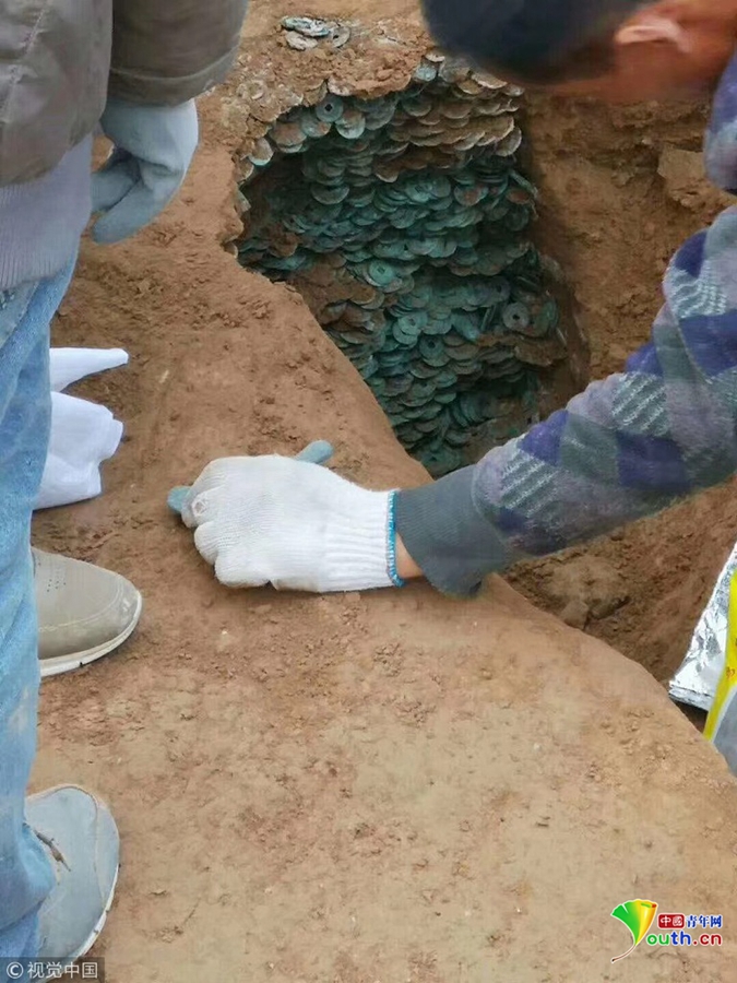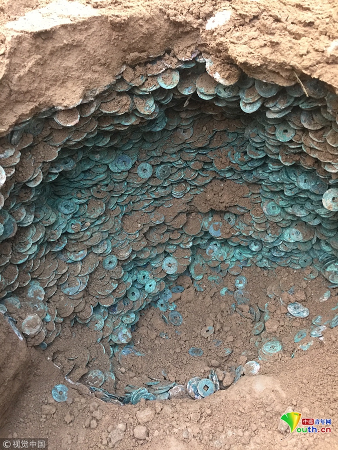 2018年11月9日,陜西渭南,白水一工地發(fā)現(xiàn)大量古幣,共清理發(fā)掘古幣920斤、約10萬枚。經(jīng)初步鑒定,這些古幣多為北宋時(shí)期錢幣,初步判斷為一般文物,對(duì)研究當(dāng)?shù)亟?jīng)濟(jì)等有一定價(jià)值。圖片:視覺中國。文字:華商報(bào)