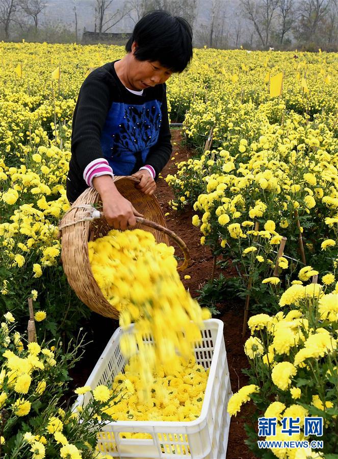 11月14日,在河南省內(nèi)鄉(xiāng)縣乍曲鎮(zhèn)水溝村千畝酈邑貢菊基地,農(nóng)戶將采摘的菊花裝筐。 近年來(lái),河南省內(nèi)鄉(xiāng)縣依托資源優(yōu)勢(shì),把發(fā)展特色農(nóng)業(yè)作為精準(zhǔn)扶貧的重要舉措,采取“公司+合作社+農(nóng)戶”的方式,招引農(nóng)業(yè)龍頭企業(yè)發(fā)展菊花種植產(chǎn)業(yè),把菊花加工成茶飲、藥材等高附加值產(chǎn)品,累計(jì)帶動(dòng)150余戶貧困戶就業(yè)增收。 新華社記者 李安 攝