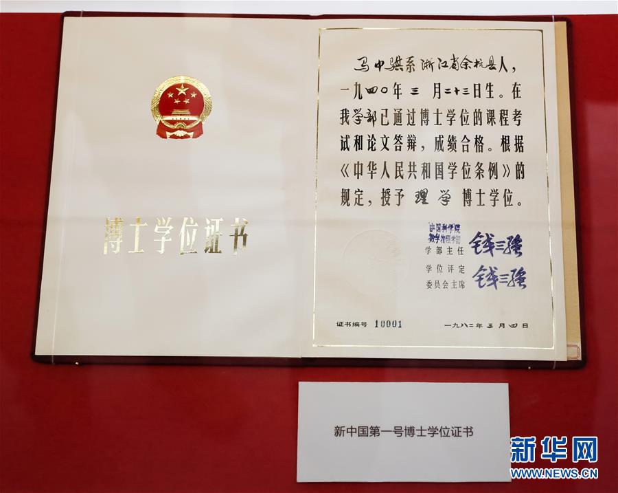 這是在“歷史巨變”展區(qū)拍攝的新中國第一號博士學(xué)位證書(11月15日攝)。