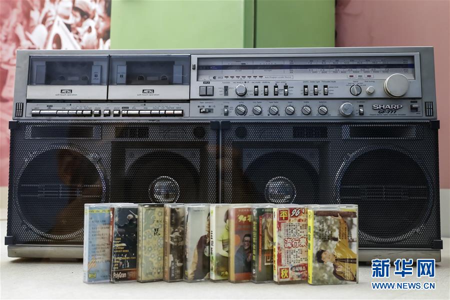 這是“歷史巨變”展區(qū)展示的老式收錄機和磁帶(11月15日攝)。