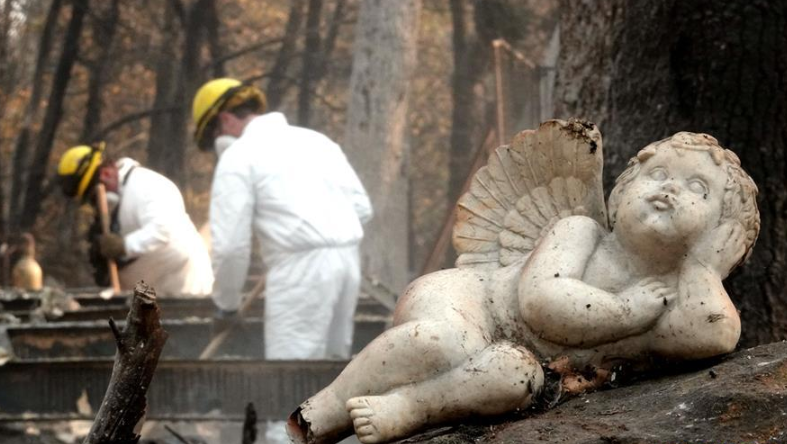 11月18日,在美國(guó)加利福尼亞州比尤特縣天堂鎮(zhèn),救援人員在山火廢墟中工作。