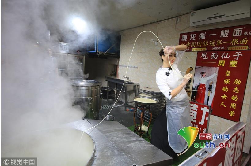 2018年11月19日,成都,繼“妖嬈拉面哥”之后,黃龍溪古鎮(zhèn)一個身材高挑的古裝美女,一邊跳舞一邊揮甩著手中的面條被贊“甩面仙子”走紅網(wǎng)絡。圖片作者:紅葉/視覺中國