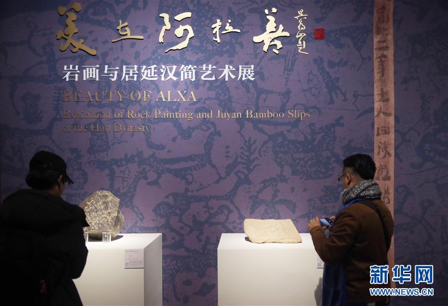 當(dāng)日,“美在阿拉善——巖畫與居延漢簡(jiǎn)藝術(shù)展”在北京中國(guó)美術(shù)館開幕,共展出巖畫實(shí)物、雕塑、拓片、漢簡(jiǎn)等共計(jì)100多件。 新華社記者 魯鵬 攝