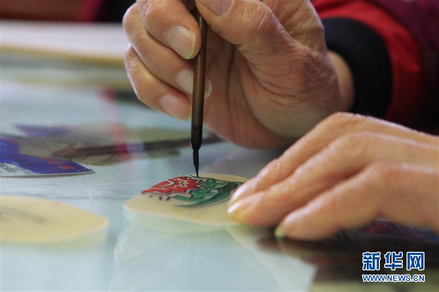 11月20日,在浙江海寧市南關(guān)廂歷史街區(qū),張坤榮在給皮影道具上彩。新華社記者隋先凱攝