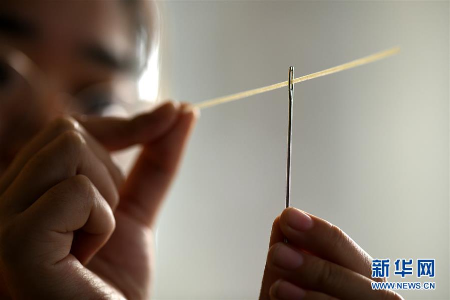 11月23日,在石家莊市藁城區(qū)耿家莊村某宮面生產(chǎn)廠,工人演示用藁城宮面穿過縫針眼。