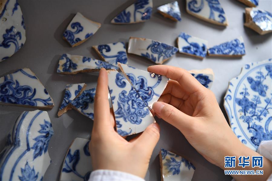 在江西景德鎮(zhèn)御窯廠遺址,工作人員正在修復(fù)明代瓷枕(10月18日攝)。 新華社記者 萬象 攝