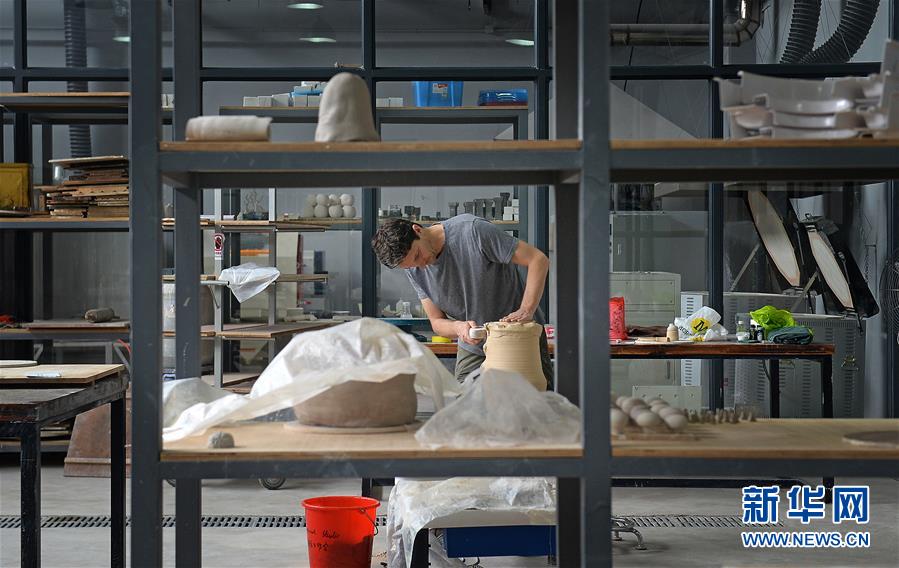 在江西景德鎮(zhèn)陶溪川文創(chuàng)街區(qū)的國際工作室,一位來自美國的藝術(shù)家在制作陶瓷藝術(shù)品(2016年10月20日攝)。 新華社記者 萬象 攝
